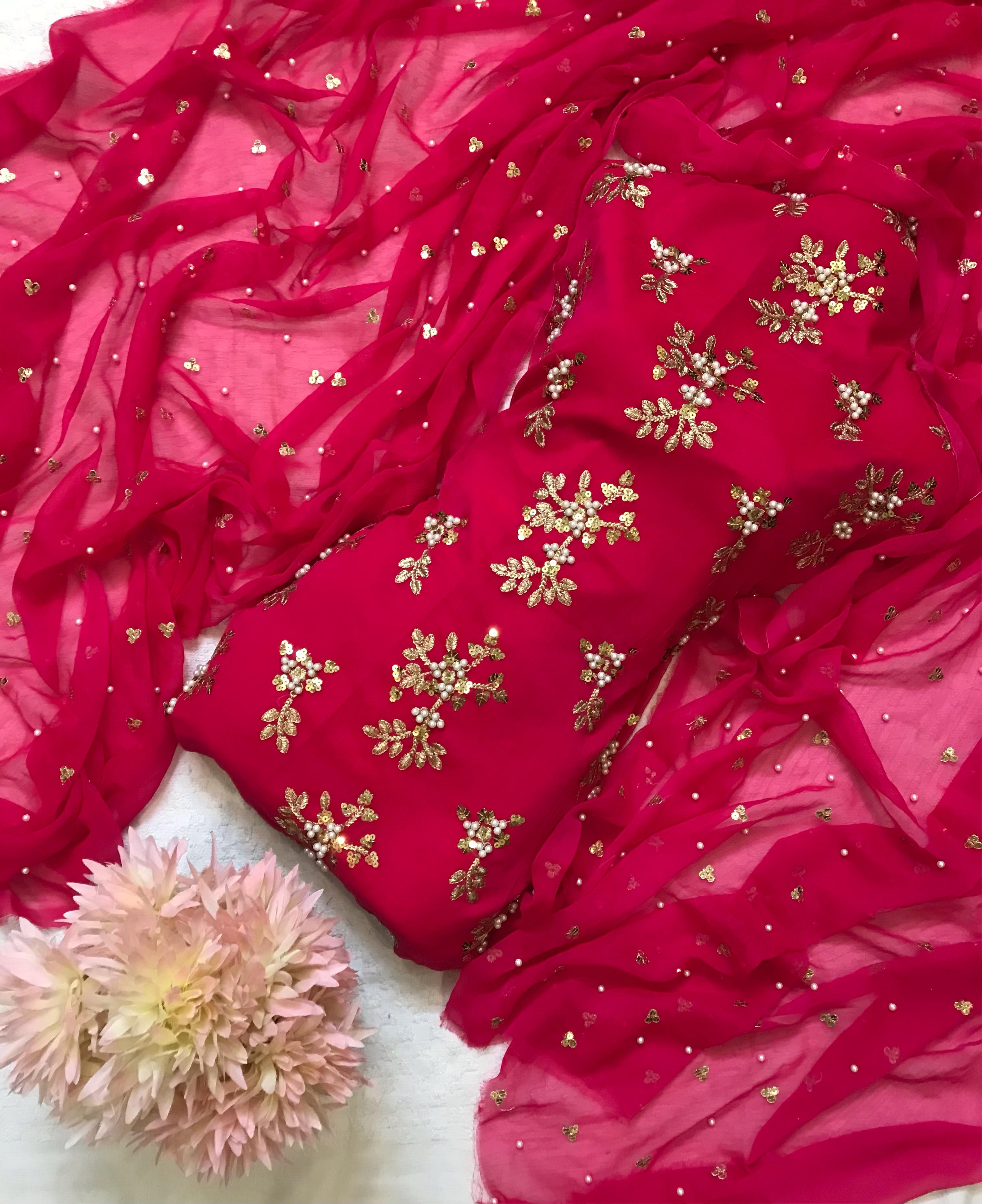 "Stunning chiffon dress featuring exquisite heavy bunch pearls handwork on the front, complemented by a beautiful booti pearls handwork dupatta. Includes sleeves and back and a plain malai trouser. Perfect for elegant occasions."