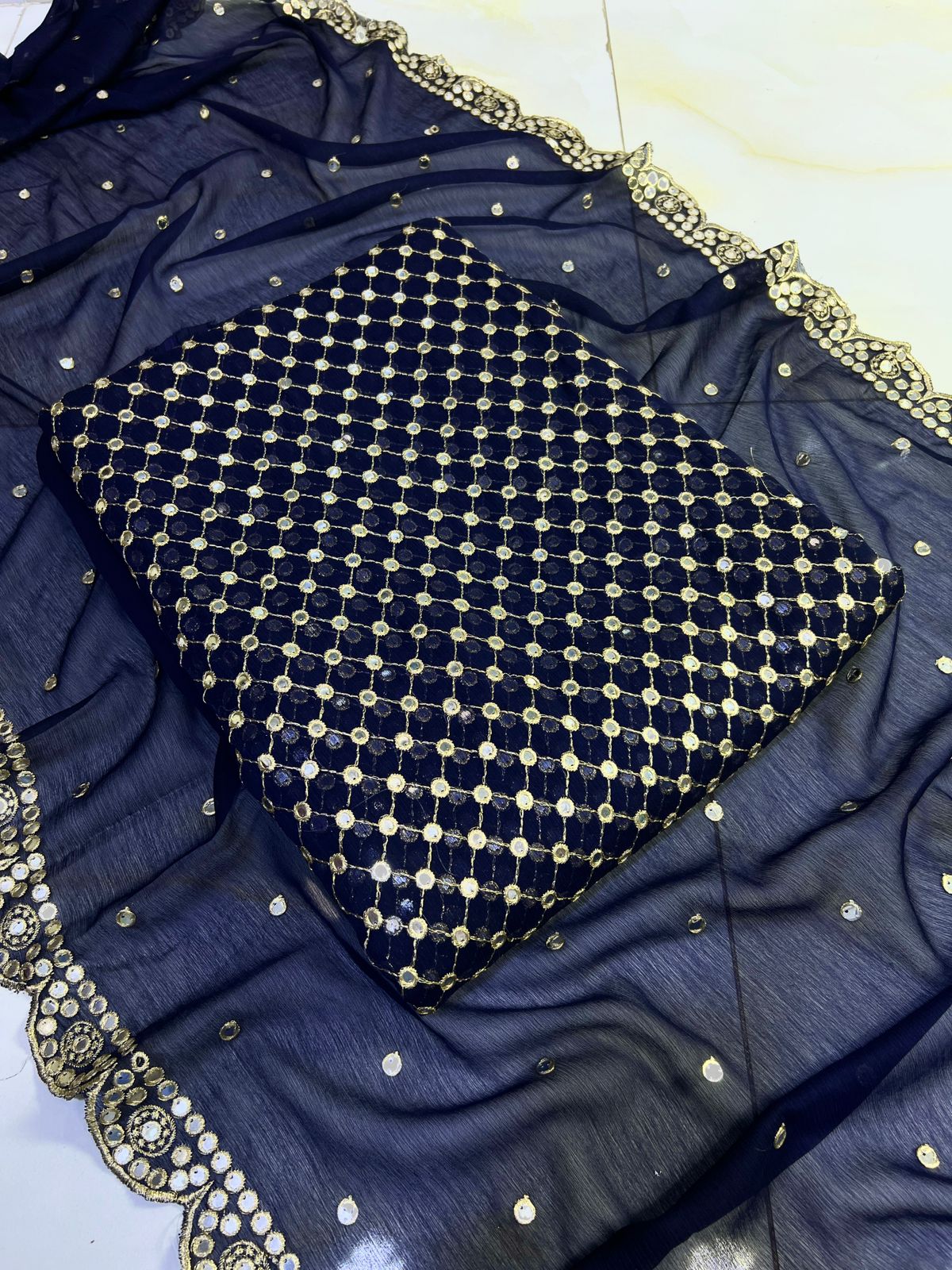 Made on soft chiffon with 9MM sequins that shine like mirror work. Comes with 2.75 yd shirt, 2.5 yd dupatta, and 2.5 yd trouser – extra shirt fabric for easy stitching!
