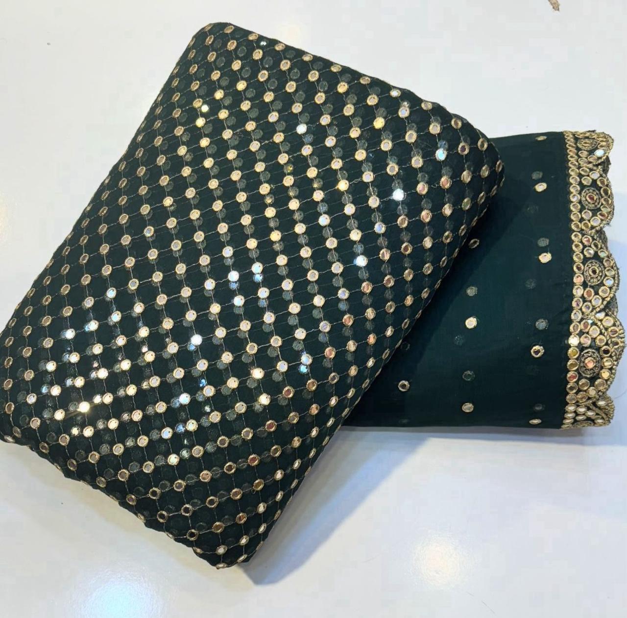 Made on soft chiffon with 9MM sequins that shine like mirror work. Comes with 2.75 yd shirt, 2.5 yd dupatta, and 2.5 yd trouser – extra shirt fabric for easy stitching!