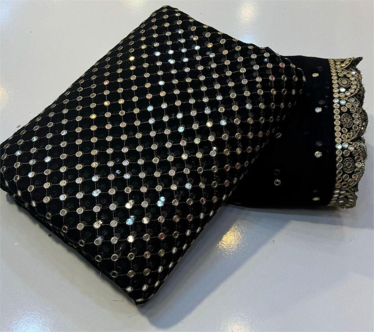Made on soft chiffon with 9MM sequins that shine like mirror work. Comes with 2.75 yd shirt, 2.5 yd dupatta, and 2.5 yd trouser – extra shirt fabric for easy stitching!