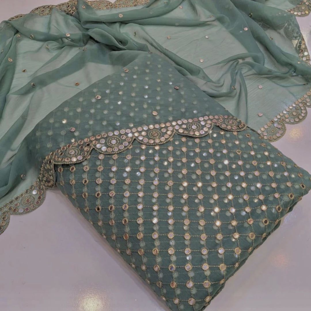 Made on soft chiffon with 9MM sequins that shine like mirror work. Comes with 2.75 yd shirt, 2.5 yd dupatta, and 2.5 yd trouser – extra shirt fabric for easy stitching!