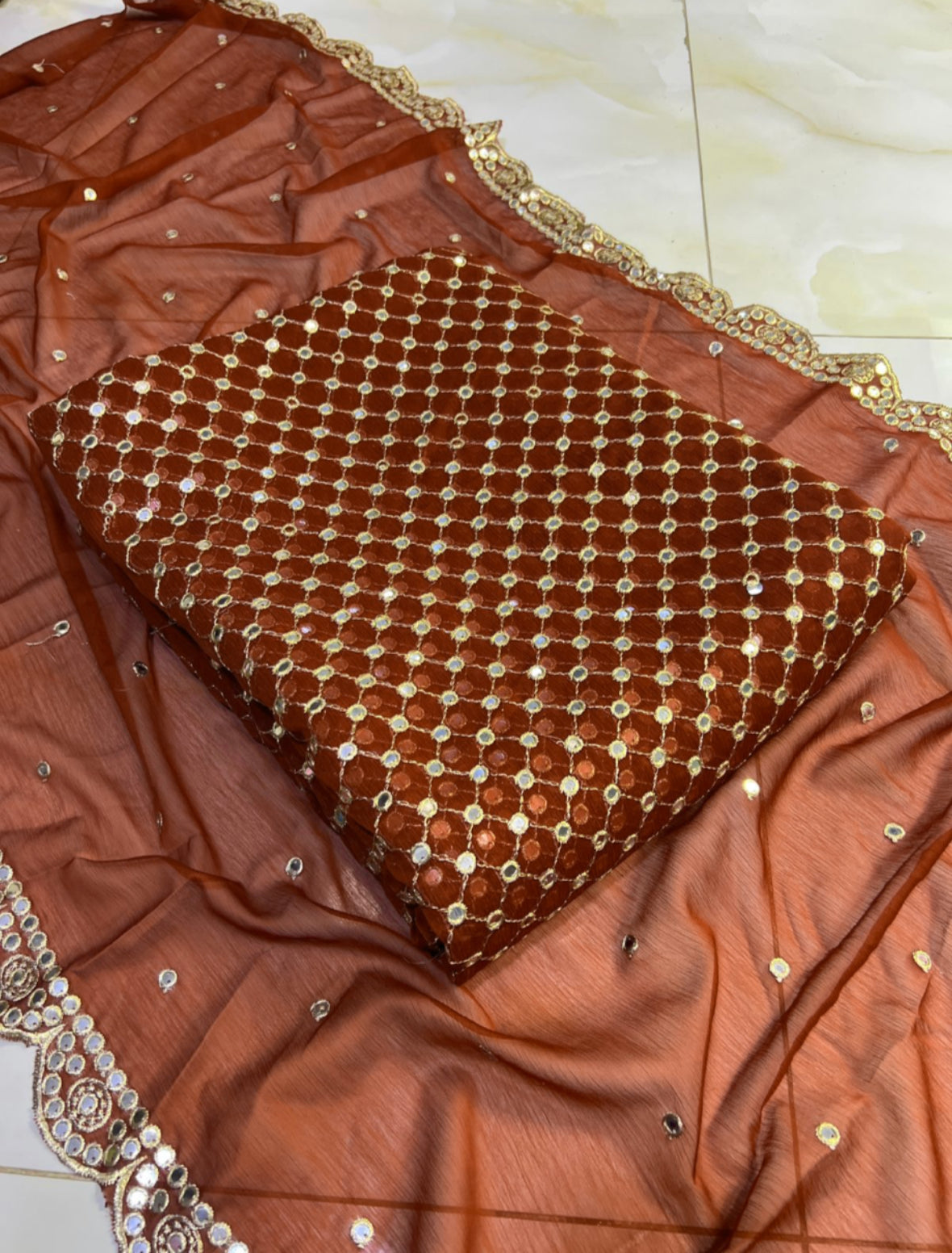This 3-piece dress is crafted from weightless chiffon with 9mm sequins. It includes a 2.5-yard heavily embroidered shirt and a 2.5-yard cutwork dupatta also 2.5 yards plain malai trouser blending style and comfort effortlessly.