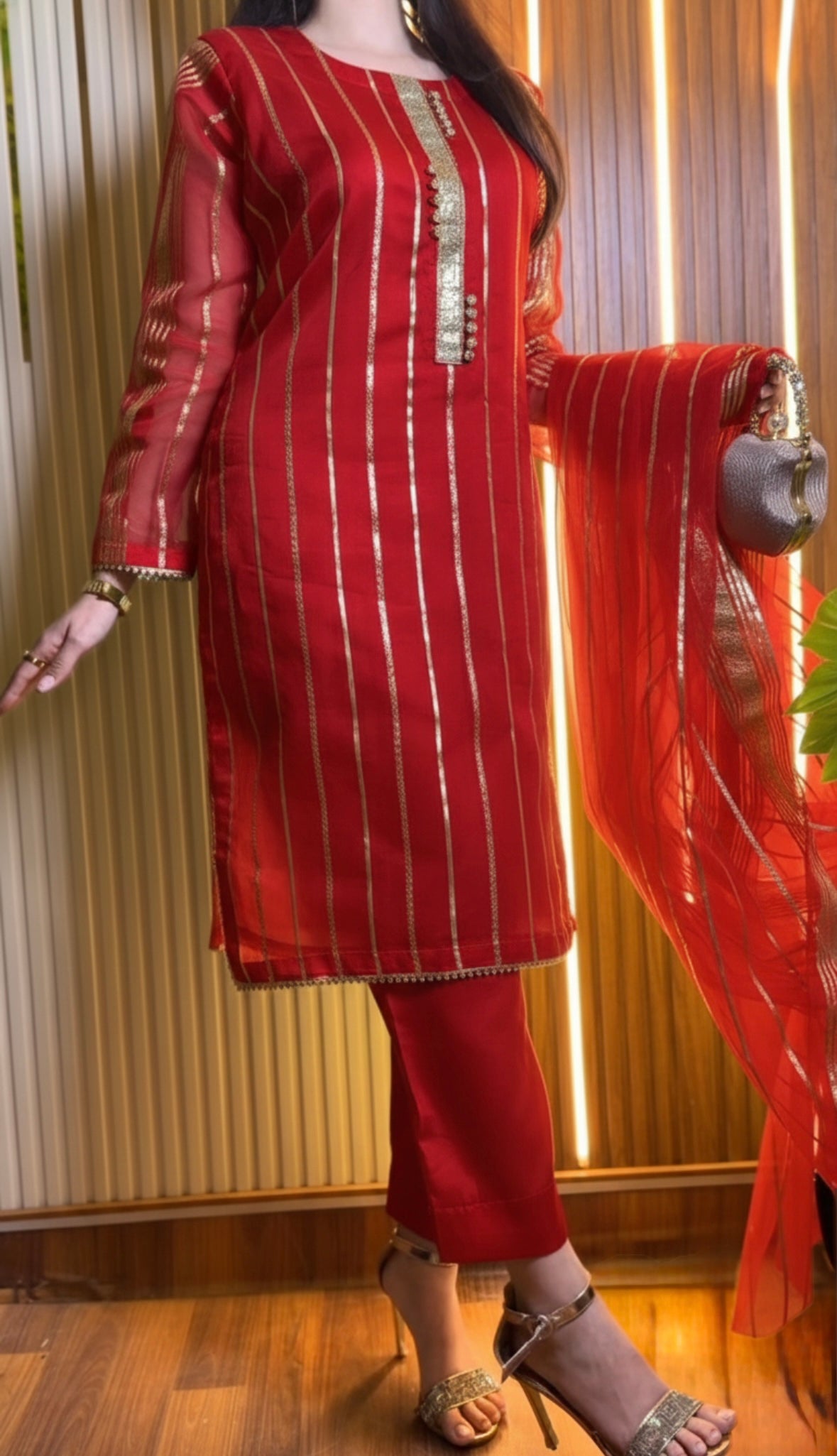 Upgrade your winter party look with our beautiful three-piece organza dress. This lovely outfit features delicate golden and silver zari work, ensuring an elegant and refined look.