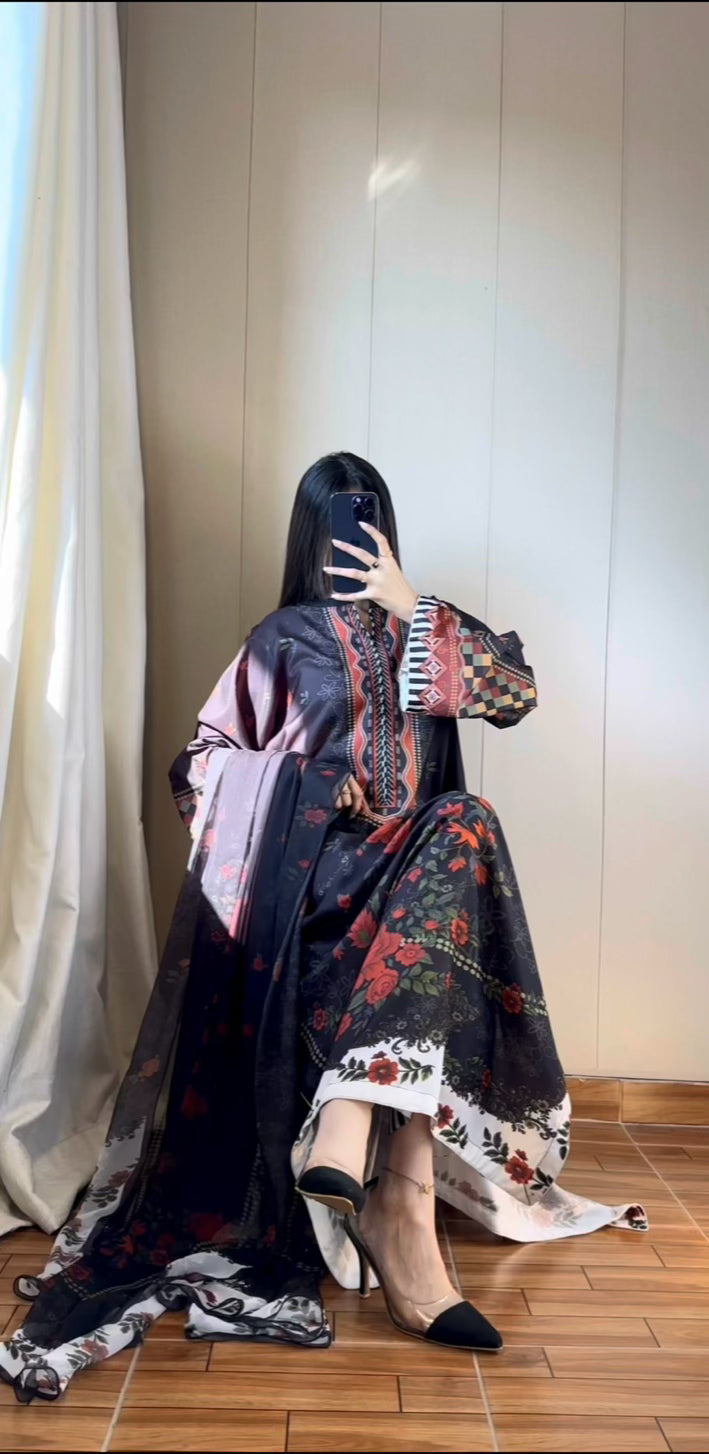 ❤️ Unstitched 3PC Red Rose Black Kaftan – Premium Soft Swiss Lawn Collection🧵 Fabric Measurement:• Shirt / Kaftan & Trouser Fabric: 4 To 4.25 yards (Width: 56–57 inches, wide fabric)• Dupatta Fabric Printed Chiffon: 2.5 yards (Width: 40–42 inches)✔ Why Choose This Black Kaftan?✓ Premium-quality soft Swiss lawn✓ Elegant black shade – timeless & slimming look✓ Light, breathable & flowy fabric that stitches beautifully✓ Perfect for casual wear, summer gatherings & evening events✓ Wholesale available for boutique & bulk buyers✅ Open Parcel & Return Policy:You can open and check your parcel in front of the rider before making payment.If the product you receive is not as shown or described, you are entitled to a hassle-free return or exchange.#pakistanifashion #blackkaftan #swisslawn #3pc #womensfashionPremium Black Kaftan, Unstitched 3PC Kaftan Pakistan, Digital Printed Kaftan, Boutique Kaftan Collection, Wholesale Kaftan Pakistan