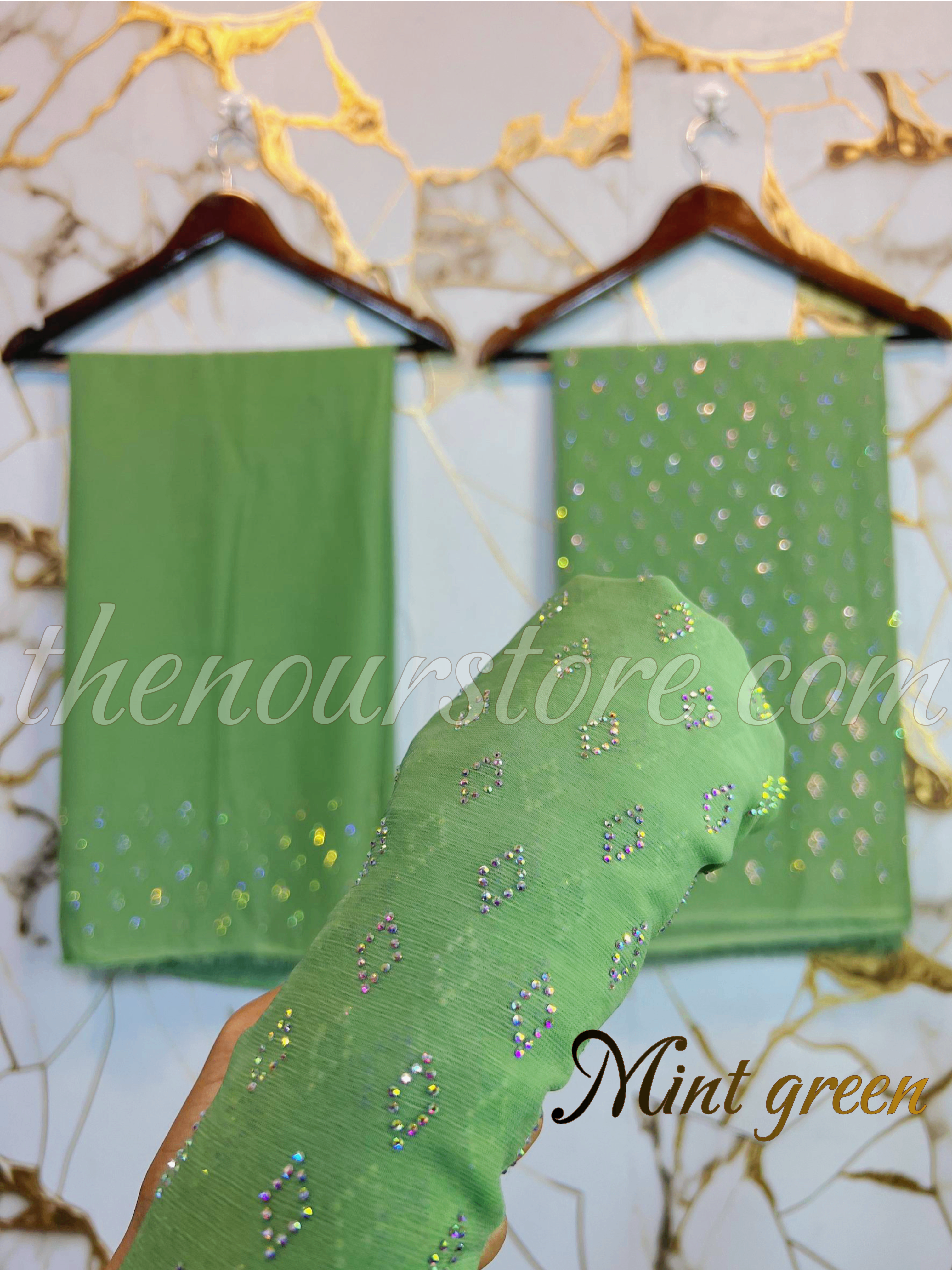 Dupatta: 2.5 yards, width: 43 inches, crystal work with double borders.