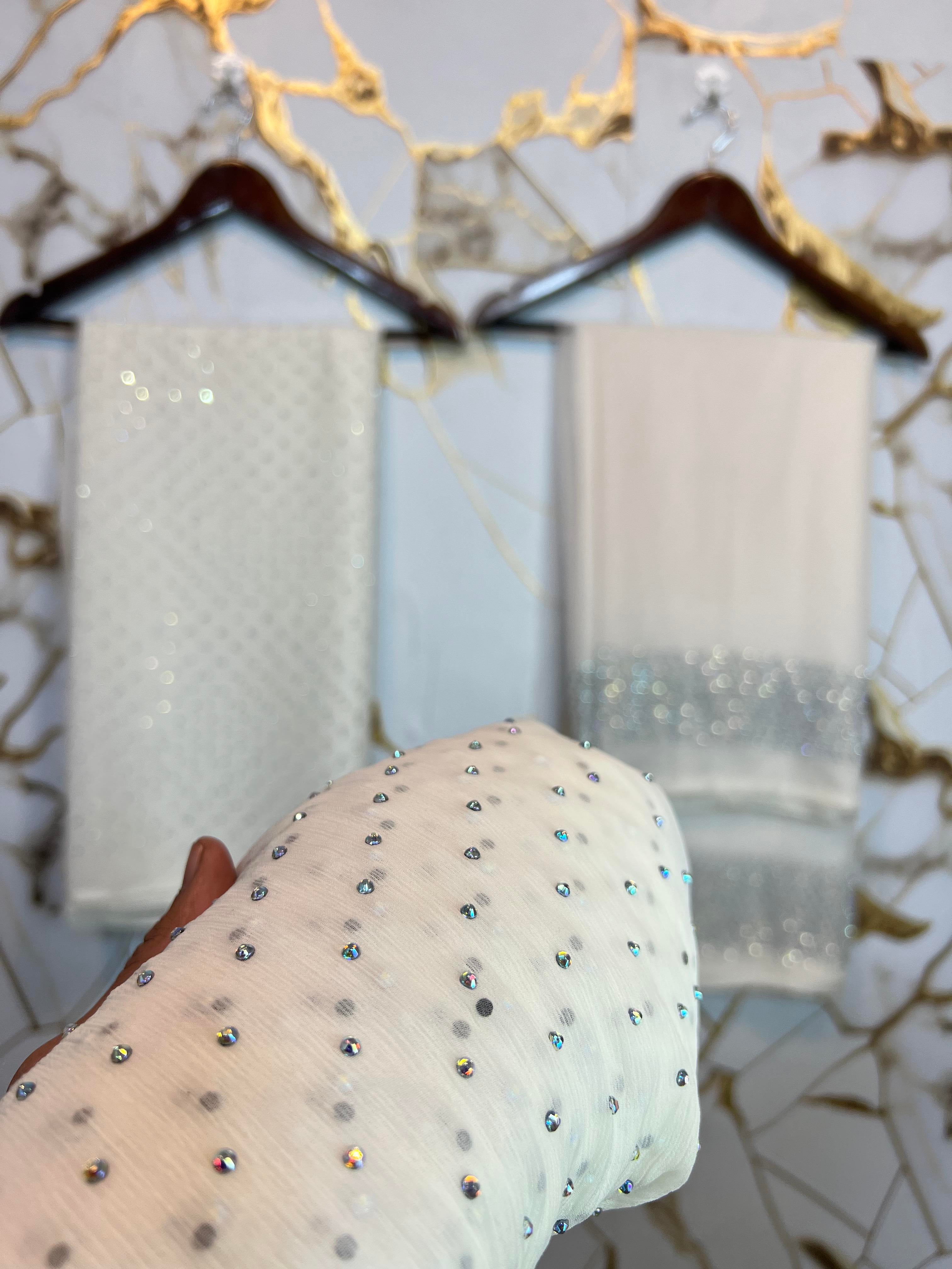 Shirt: 2.5 yards, Length: 43 inches, Pure chiffon with full crystal work.