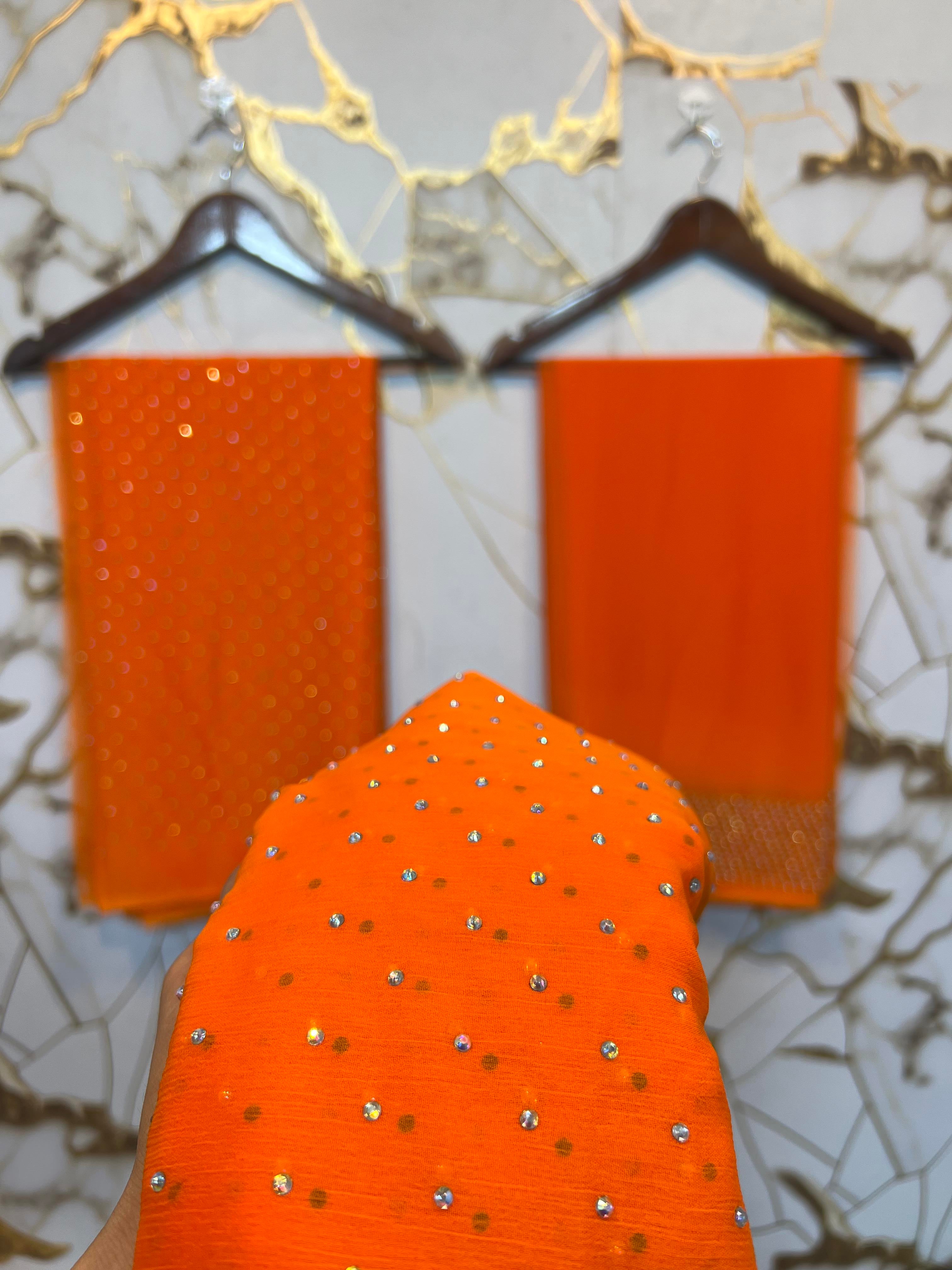 Shirt: 2.5 yards, width: 43 inches, Pure bember chiffon with full crystal work.